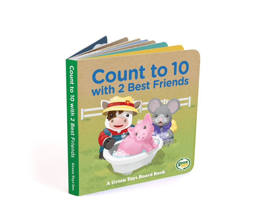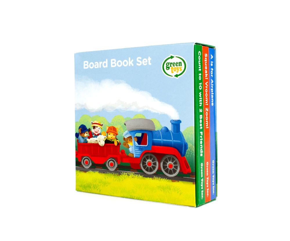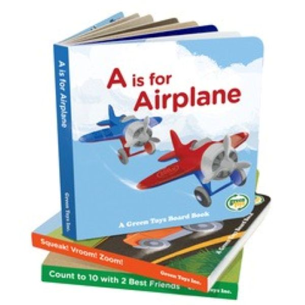 This set of three Board Books brings the fun of Green Toys story time to babies and toddlers, putting a playful new twist on the classic themes of letters, numbers, and sounds. In A is for Airplane, the journey from A to Z is an adventure through air, land, and sea that brings the alphabet to life. Counting to 10 with 2 Best Friends follows Cow and Mouse as they count from 1 to 10 throughout their busy day. Finally, discover the fun sounds Green Toys animals and vehicles make in Squeak! Vroom! Zoom! Includes storage sleeve.