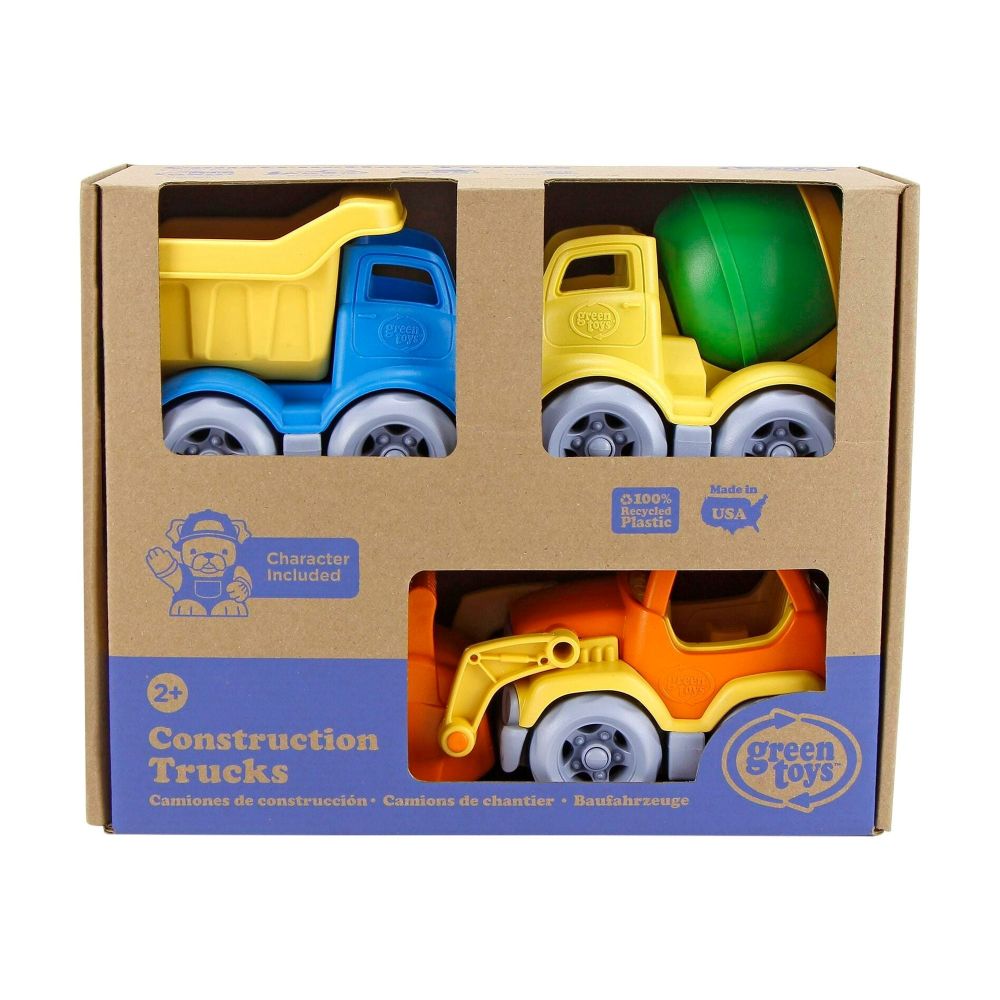 Scoop it! Mix it! Dump it! Just another earth-moving, earth-saving day at the job site for the Green Toys™ Construction Trucks! Made in the USA from 100% recycled plastic with no BPA, phthalates or PVC, the fleet includes 1 Scooper with a moveable front-loader, 1 Mixer with a revolving drum, 1 Dumper with a classic open-box bed, and 3 Construction Dogs! Perfect in a sand box, toy box, or gift box, these pint-sized trucks are just right for little hands, and can easily be tossed in a diaper bag for on-the-go fun. Each vehicle comes with its own Construction Dog, and the figures are interchangeable among all three. Built to last with no metal axles, these vehicles are made safe for children and the earth they play on.