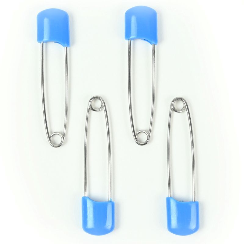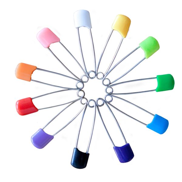 These colorful stainless steel diaper pins feature locking plastic heads and now come in eleven colors.  Sold here per pin.  Pins are 2 1/8 inches long and the plastic head portion is 7/16 inches long and wide.  Available in orange, yellow, blue, pink, purple, red, green, royal blue, light green, black and white.