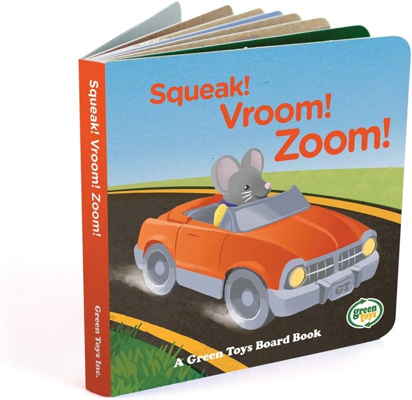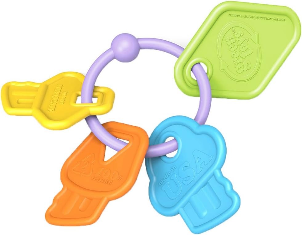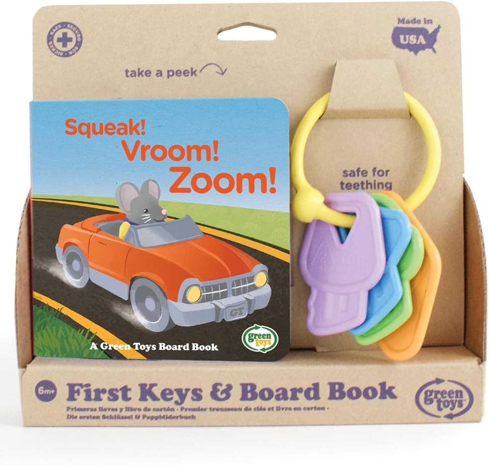 Shake, rattle, and read! This set includes the Green Toys™ First Keys and Squeak! Vroom! Zoom! board book. The super-safe First Keys feature 4 colorful, uniquely shaped keys and charms. They are lightweight for little hands, and dishwasher safe for easy cleaning. Squeak! Vroom! Zoom! brings the fun of story time to babies and toddlers, exploring the different sounds Green Toys animals and vehicles make.
