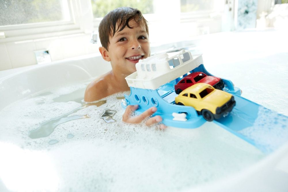Set sail with the Green Toys™ Ferry Boat for a quick bathtub excursion or an extended trans-pool voyage. Whatever the adventure, this two-story vessel is ready to hit the open water with room for eco-friendly cargo galore, and even comes with two Green Toys™ Mini Fastbacks. Use the slide-out ramp to load up the spacious bottom level that accommodates up to four Green Toys™ Mini Vehicles or Fastbacks. The open top deck features two small benches on each side, as well as eleven windows looking down into the main level. Made in the USA from 100% recycled plastic milk jugs that save energy and reduce greenhouse gas emissions, this craft is ideal for any body of water - durable, buoyant, and dishwasher safe. The hull also detaches for easy cleaning. No BPA, phthalates, PVC, or external coatings. Packaged using recycled and recyclable materials and printed with soy inks.