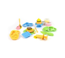 Stamp! Stack! Serve! This 20-piece set makes it simple for even the youngest dough molder to create delightfully custom cakes: 6 cake cutters 3 cake stamps 1 frosting extruder 1 knife 1 serving saucer 1 cake stand 2 forks 2 knives 3 dough tubs Made with Organic...