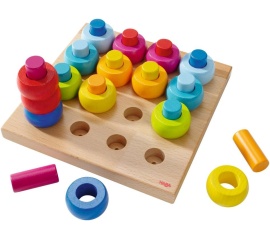 A HABA classic and Montessori learning favorite! This solid wooden board holds 16 brightly colored wooden pegs and 16 rings that will engage toddlers and preschoolers in creative, imaginative play. Perfect for little hands, the pegs and rings easily plug into the sturdy board. Your little one...
