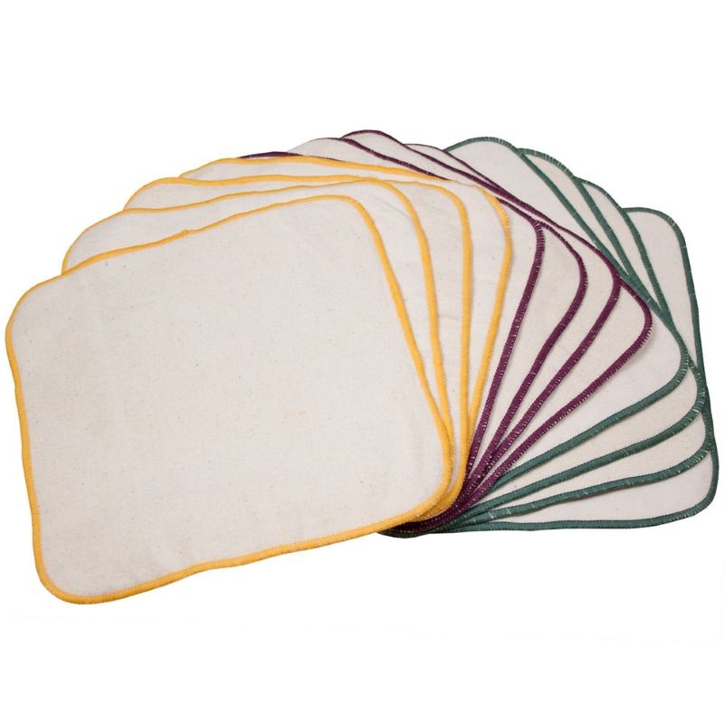 Made with a layer of soft terry velour sewn on a flannel backing. Extra absorbent, great for wiping baby's little hands and face. 100% cotton 8 by 8 inches. One dozen per package. Thicker than our very popular single layered flannel wipes. Made for those parents desiring something a little more substantial for wiping babies behinds. These also make nice wash cloths.