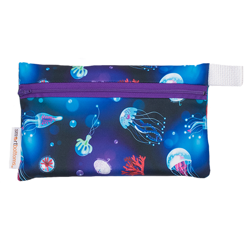 The Mini Wet Bag is the perfect multi-use bag to hold small items like wipes or snacks, and features a small tab that you can loop the snapping handles of your other Smart Bottoms wet bags through. Made in the USA.