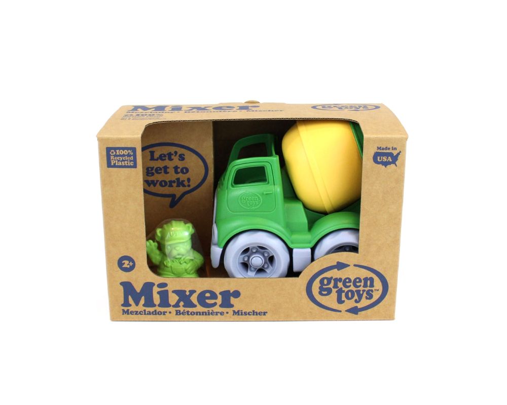 Scoop it! Mix it! Dump it! Just another earth-moving, earth-saving day at the job site for the Green Toys™ Construction Trucks, made in the USA from 100% recycled plastic milk jugs that save energy and reduce greenhouse gas emission. Chunky, sturdy, and durable, the Mixer's revolving drum spins in both directions. Perfect in a sand box, toy box, or gift box, this pint-sized truck is just right for little hands, and can easily be tossed in a diaper bag for on-the-go fun. The rest of the fleet (sold separately) includes the Scooper and the Dumper. Each vehicle comes with its own bulldog construction worker, and the figures are interchangeable among all three. Great for individual play, or sharing and swapping with friends.