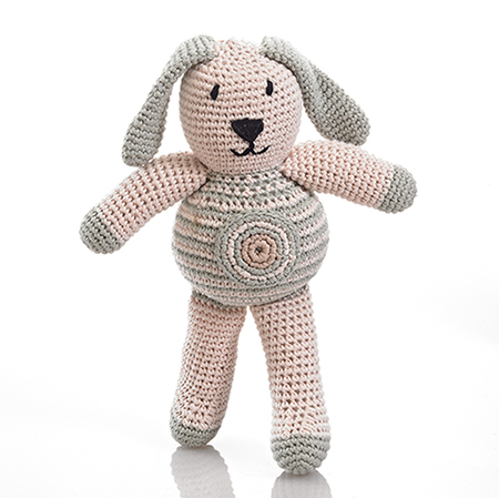 All babies love bunnies. We've made this bunny in 100% organic cotton for a beautiful hand crochet toy that is bound to become a favorite with your little one. A super size for a baby or toddler to cuddle. All Pebble toys are 100% cotton with 100% polyester fill. Handmade by talented artisans in rural production centers and offering women the opportunity of flexible, local, fairly paid work. They are all machine washable and can be tumble dried on a low setting.