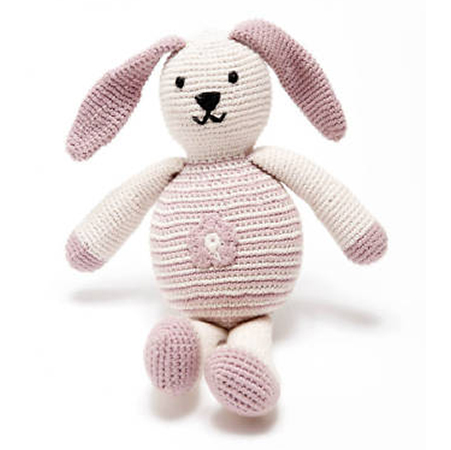 All babies love bunnies. We've made this bunny in 100% organic cotton for a beautiful hand crochet toy that is bound to become a favorite with your little one. A super size for a baby or toddler to cuddle. All Pebble toys are 100% cotton with 100% polyester fill. Handmade by talented artisans in rural production centers and offering women the opportunity of flexible, local, fairly paid work. They are all machine washable and can be tumble dried on a low setting.