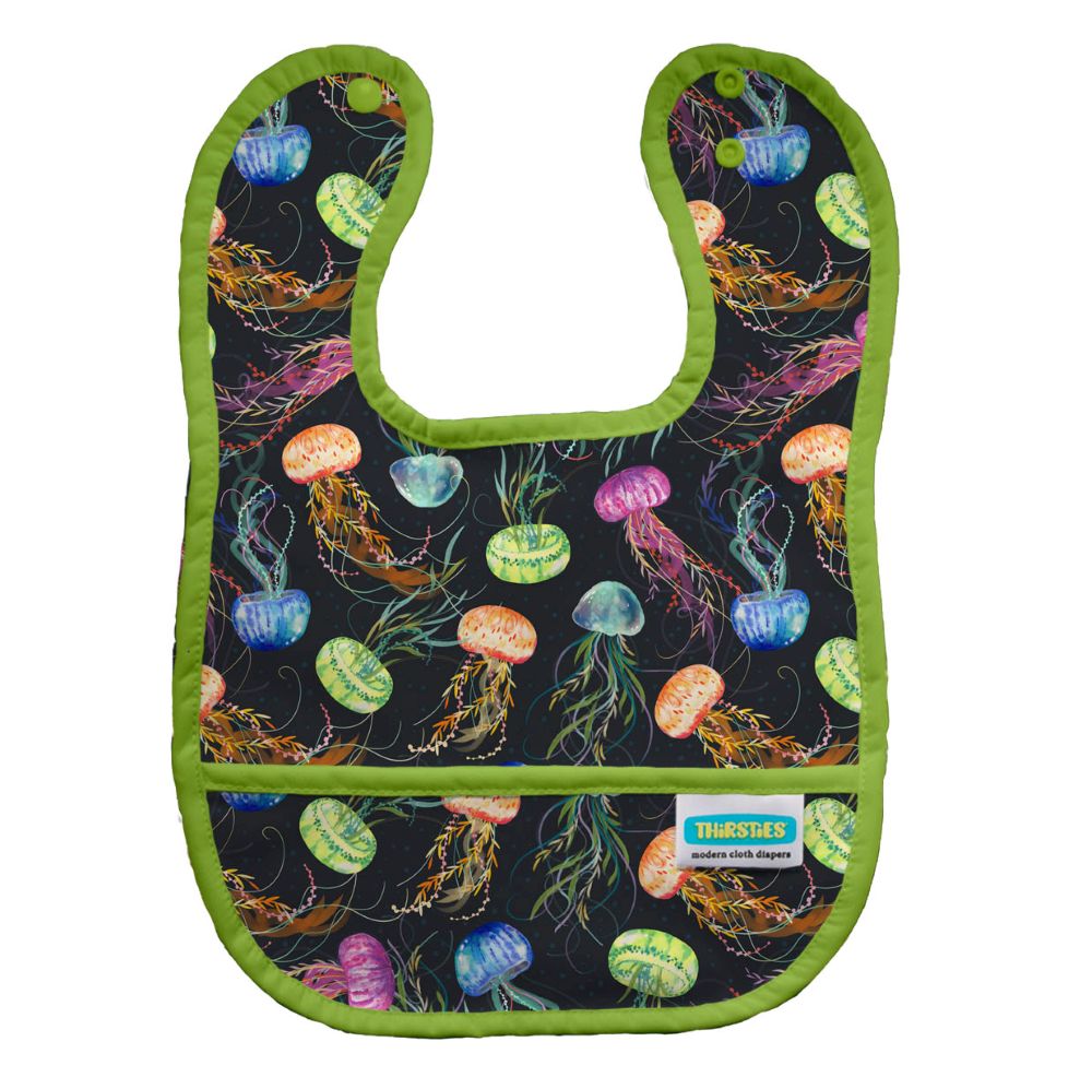 Please welcome Thirsties Pocket Bib to our regular line of products! We’ve made cleanup simple with this easy-to-clean, waterproof bib with two adjustable snap settings and a handy crumb catcher. Thirsties Pocket Bib is made with our waterproof PUL, backed with white mesh, and trimmed with matching binding.