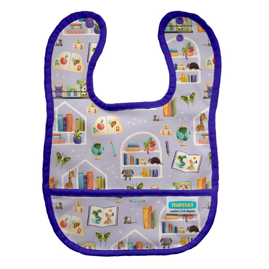 Please welcome Thirsties Pocket Bib to our regular line of products! We’ve made cleanup simple with this easy-to-clean, waterproof bib with two adjustable snap settings and a handy crumb catcher. Thirsties Pocket Bib is made with our waterproof PUL, backed with white mesh, and trimmed with matching binding.