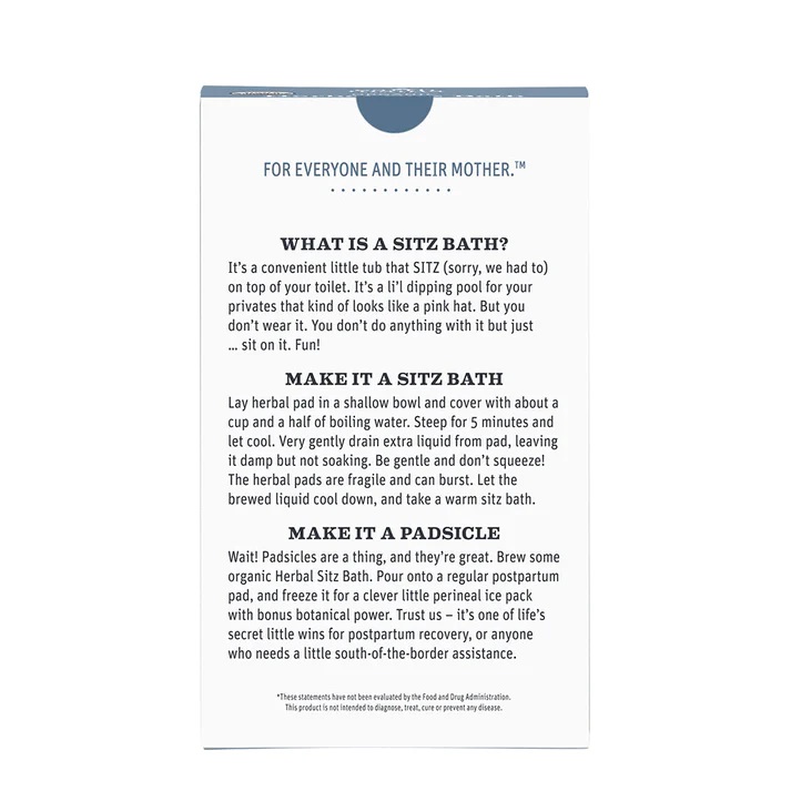 If you want to create a soothing compress, lay the herbal sitz bath pad in a shallow bowl and cover with boiling water. Steep for approx. 5 min., and let cool. Very gently drain extra liquid from pad, leaving it moist but not soaking. Be gentle and don’t squeeze! The herbal pads are fragile and can burst. Cool in the fridge and gently apply moist pad directly to perineum. Ahhhhhhh.