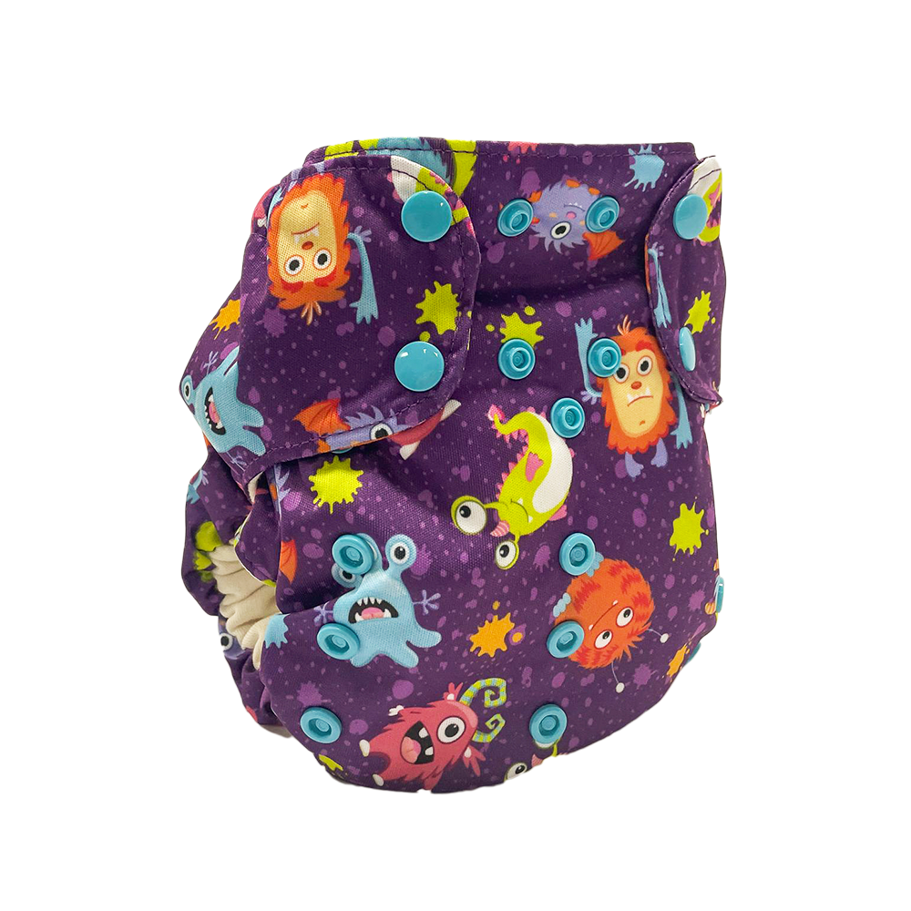 The Smart One is an organic, one-size, AIO diaper. This diaper will fit most babies 8lbs-35lbs.